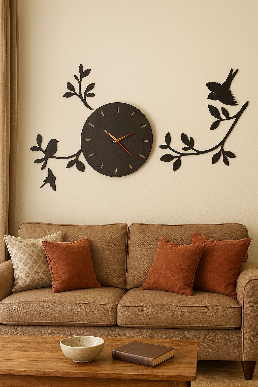 This artistic wall clock features a sleek black circular dial with golden hands, accented by a swinging pendulum at the bottom. Surrounding the clock are beautifully designed branches with perched birds, creating a natural and lively look. Perfect for adding charm to your living room, bedroom, or office, this clock combines functionality with elegant wall décor.